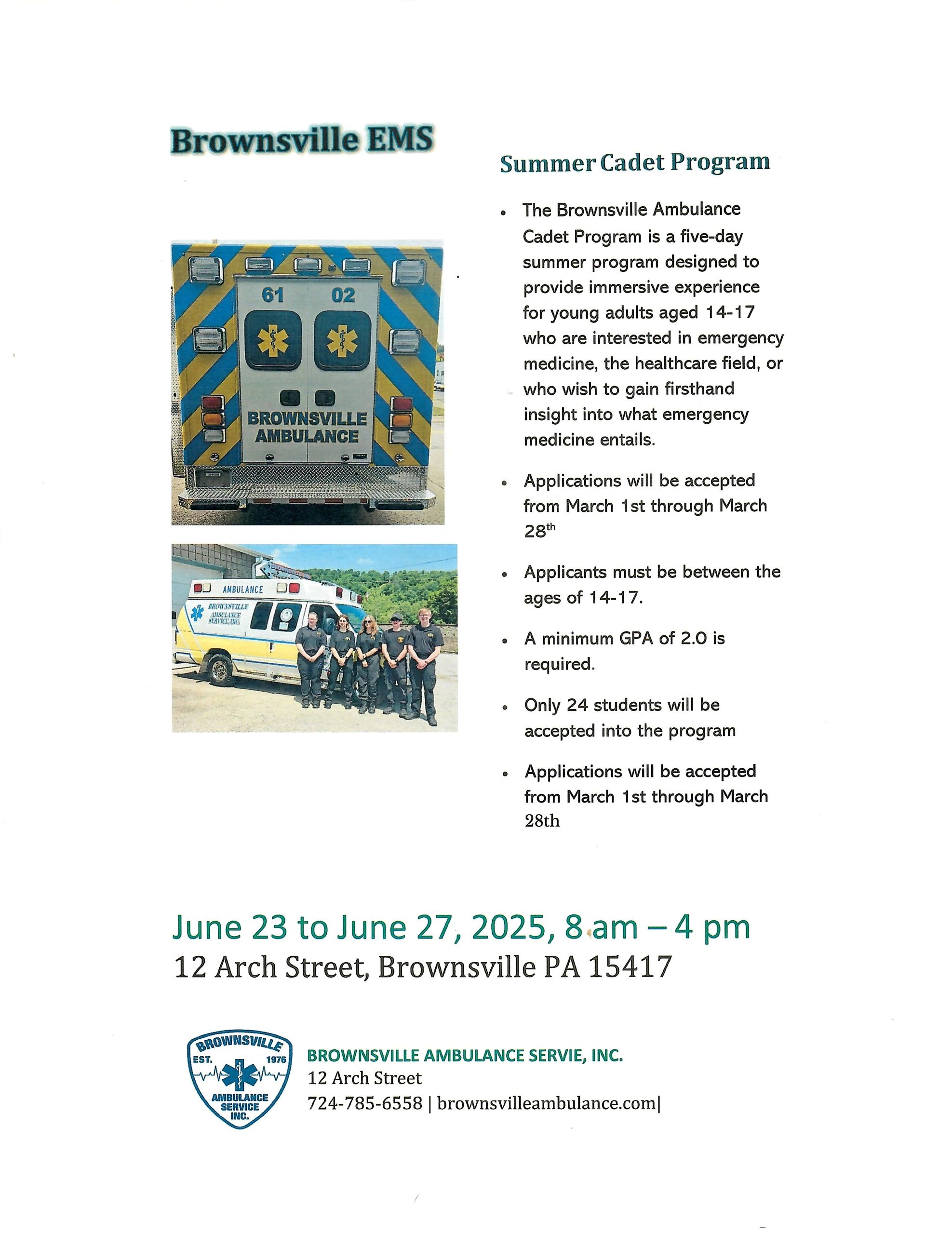 The Brownsville Ambulance Cadet Program is a five-day summer program designed to provide immersive experience for young adults aged 14-17 who are interested in emergency medicine, the healthcare field, or who wish to gain firsthand insight into what emergency medicine entails.
